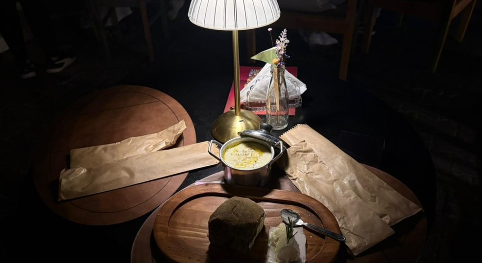 | Sopa de repolho com pão foi primeiro prato a ser servido durante a sessão cinema do 'Misteroni Bistrô' em Sorocaba (SP) — Foto: Beatriz Pereira/g1 |