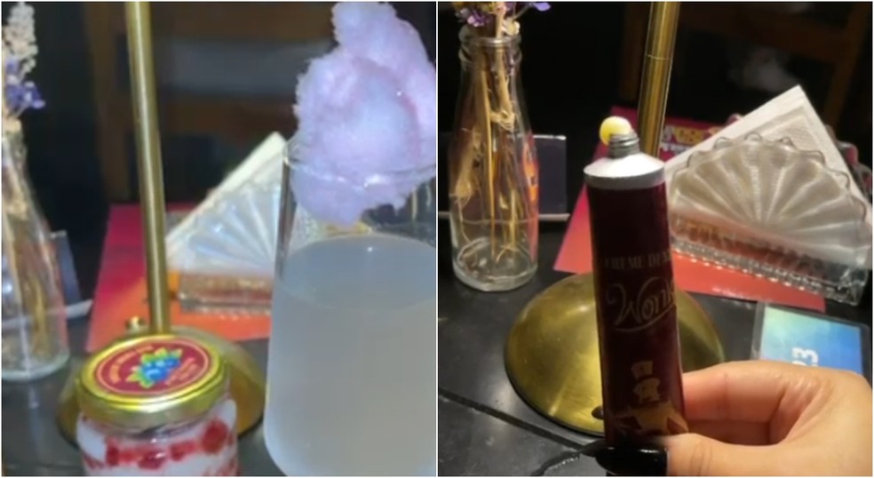 | Bebida foi um espumante com um pedaço de algodão doce para ser afundado na taça e um creme de chocolate branco em bisnaga foram servidos durante a sessão em Sorocaba (SP) — Foto: Beatriz Pereira/g1 |